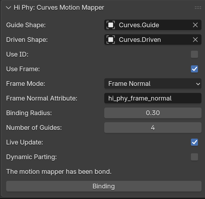 Motion Mapper will only take effect after binding. The binding will considered failed, if any of the driven curve is unable to bind to any guide curves due to radius or ID. Binding data is currently not stored in the Blender scene, so every-time blender is opened, binding will need to be redone.