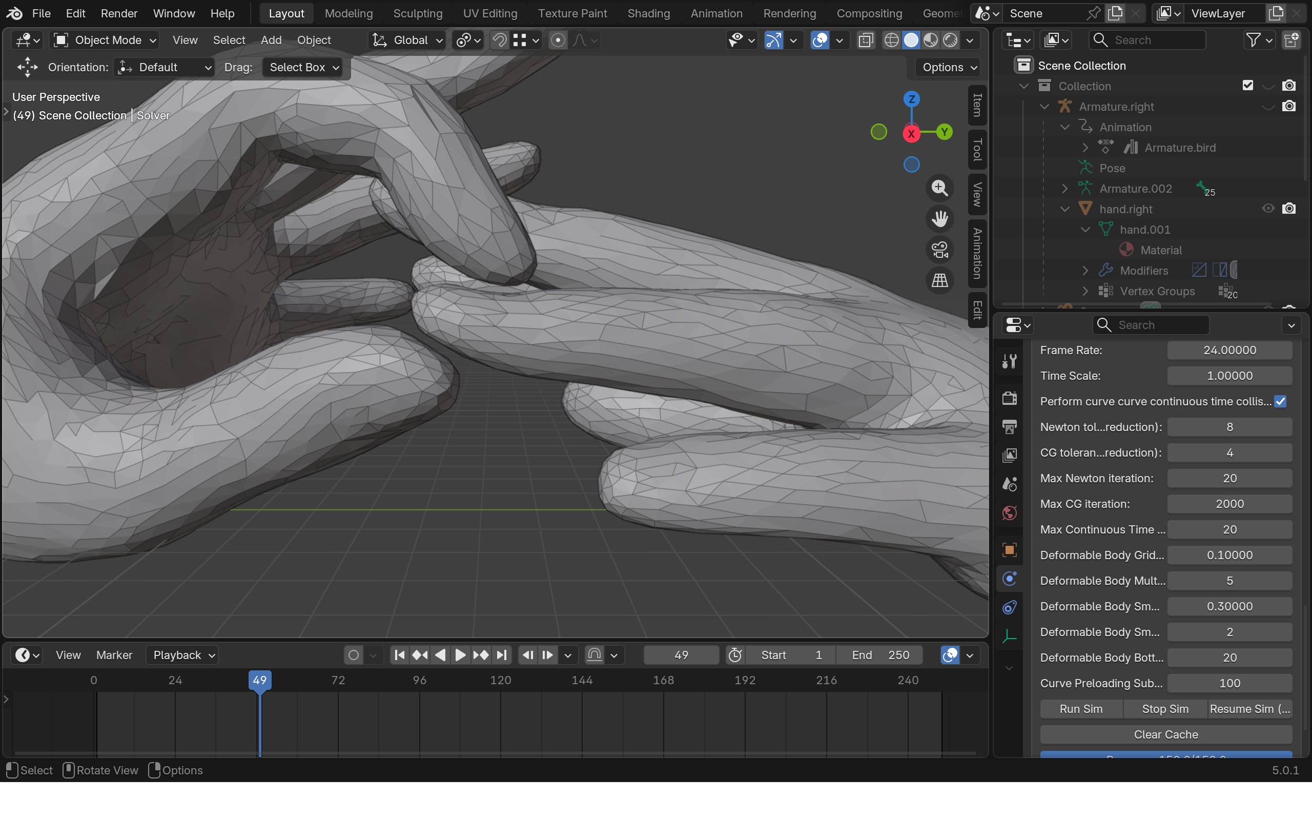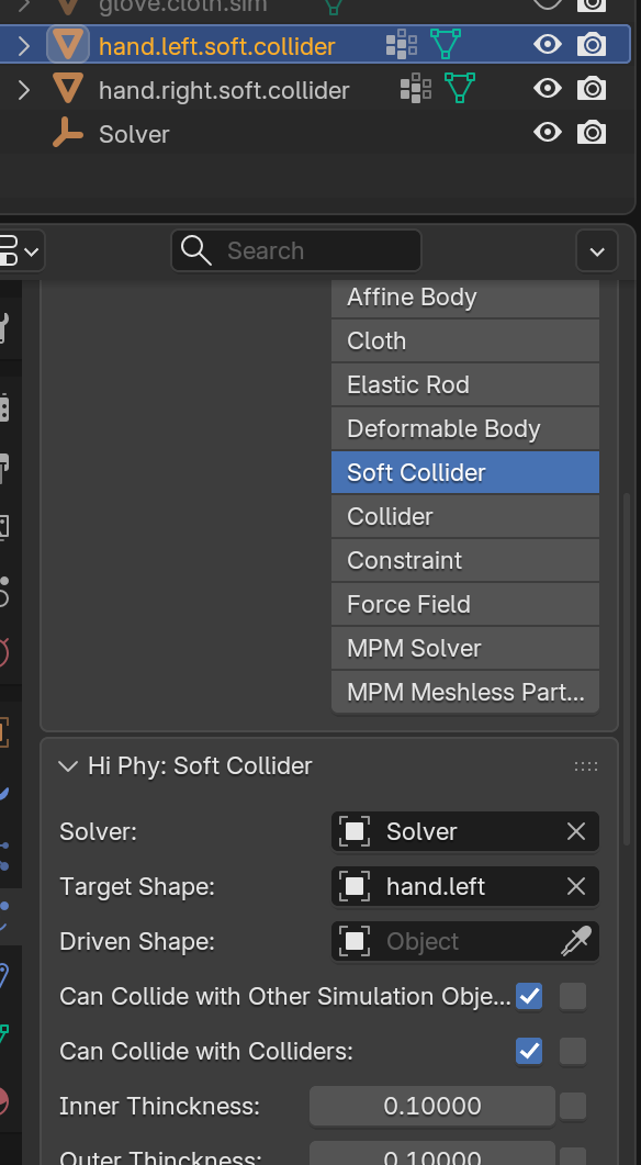 - To create the soft colliders, select hand.right/left.soft.collider, goto the physics panel, turn on HiPhy, select Soft Collider. Choose the solver object for the Solver parameter and the corresponding animated hand mesh for the Target Shape parameter.