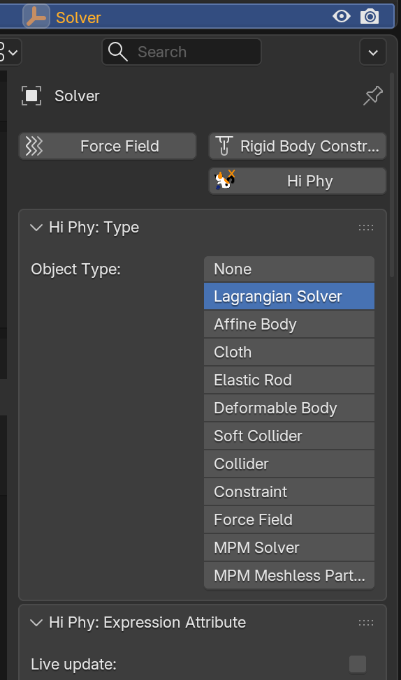 To create a HiPhyEngine solver, add an empty plane axis object, rename it solver, goto the physics panel, turn on HiPhy, select Lagrangian Solver