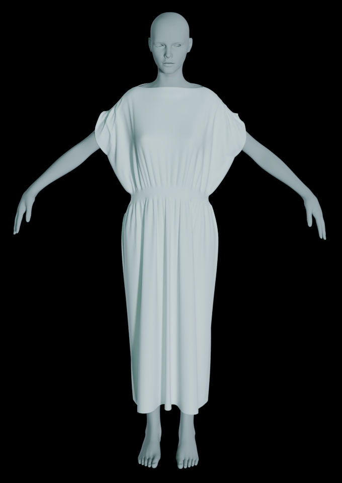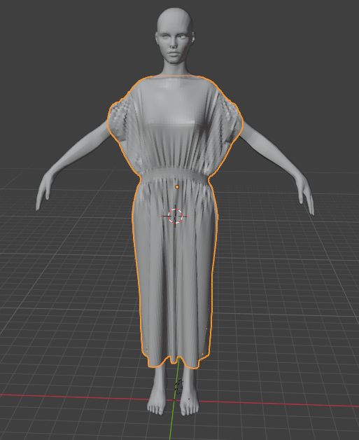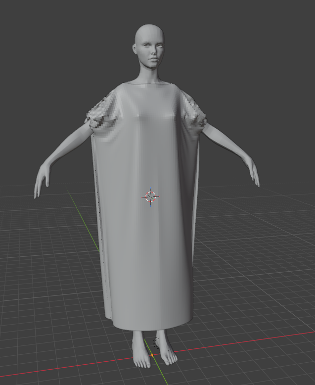 The model used here is in an A pose. T pose is the better choice in most cases as it makes it easier for the sleeves to fit around the shoulder. However, in this example, the A pose is good enough.
