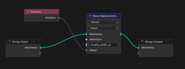 To use the UV panel model, user will need to provide the hiphy_cloth_uv attribute. However, the cloth panel is perfectly flat and therefore we can directly use the local coordinate the cloth panel to the hiphy_cloth_uv attribute, by using a simple geometry node.