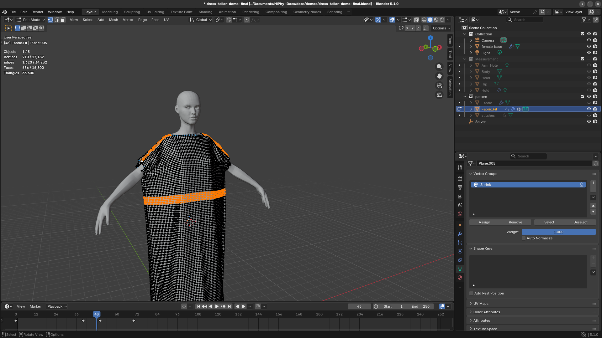 The reason we need to have a longer animation for stitches here, is because we are having an A pose. We need the dress to drip slightly, so the sleeve hole will form around the arm properly. If your character started with a T pose. It will be a lot easier.